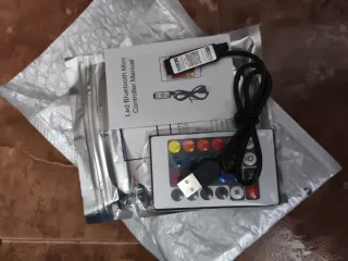 Controlador Bluetooth para tiras LED RGB de 5 metros. Incluye mando a distancia y manual. - Control por Bluetooth. - Mando a distancia con múltiples colores y efectos. - Puerto USB para alimentación.