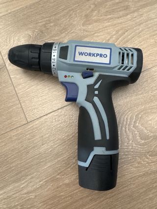 Taladro inalámbrico Workpro de 12V, ideal para trabajos en casa o profesionales. Incluye su cargador. - Marca: Workpro - Voltaje: 12V - Color: Gris y azul - Incluye cargador de corriente