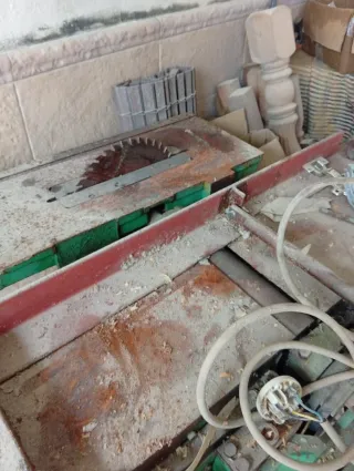 Máquina de carpintería combinada con sierra circular y motor. - Estructura metálica verde y roja. - Incluye motor eléctrico. - Base con ruedas para facilitar el desplazamiento.