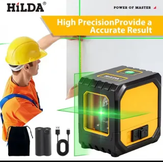 Se vende nivel láser de la marca HILDA, ideal para trabajos de medición y alineación. - Incluye trípode compacto. - Bolsa de transporte de terciopelo negro. - Cable de carga USB. - Manual de instrucciones.