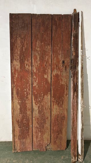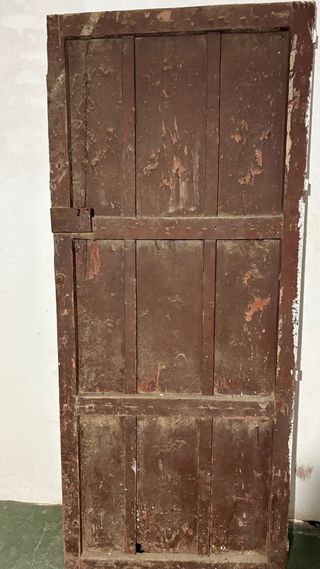 Puerta antigua de madera con acabado en color marrón. Presenta un diseño clásico con paneles verticales y horizontales. año 1985 Negociable o cambio por algo que me interese - Estructura de madera. - Color marrón desgastado. - Diseño de paneles.