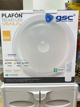 *NUEVO A ESTRENAR* Plafón de techo LED modelo Venus con una potencia máxima de 60W. Es regulable en intensidad y temperatura de color. - Diámetro: 565mm - Temperatura de color regulable: 3000K (cálida), 4200K (día), 6500K (fría) - Flujo luminoso: 2100lm / 4200lm - Color: Blanco - Incluye mando a distancia - Ahorro energético del 80%