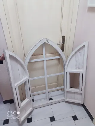 Conjunto de dos ventanas decorativas de estilo rústico, pintadas en blanco con un acabado desgastado. - Diseño con arco gótico. - Cada ventana tiene un panel central con un marco interior. - Ideales para añadir un toque vintage a tu hogar.