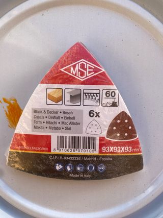 Conjunto de 6 lixas triangulares MSE Delta. - Grão 60. - Medidas: 93x93x93 mm. - Compatível com Black & Decker, Bosch, Casals, DeWalt, Einhell, Ferm, Hitachi, Mac Allister, Makita, Metabo, Skil. - Fabricado em Itália.