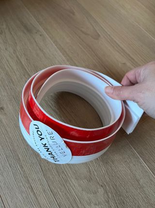 Burlete de la marca Vellure, diseñado para evitar corrientes de aire en puertas. - Color blanco y rojo. - Rollo de burlete.