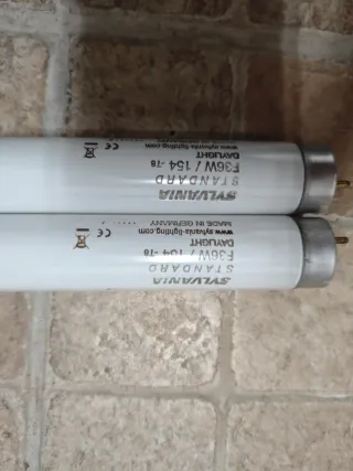 13 tubos fluorescentes de la marca Sylvania. - Modelo: F36W/154-18 y F36W/104-18. - Tipo: Standard Daylight. - Fabricados en Alemania. Más a parte 1 tubo fluorescente de la marca Osram -Modelo: L36W/865 -Tipo: Cool Daylight 1€ por unidad Los 14 por 10€