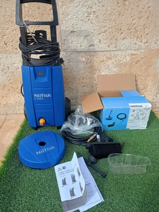 Hidrolimpiadora Nilfisk C 120.6 en color azul funciona perfectamente - Incluye varios accesorios para su uso. - Manguera de alta presión. - Cepillo. - Disco para limpieza de superficies. - Manual de usuario.
