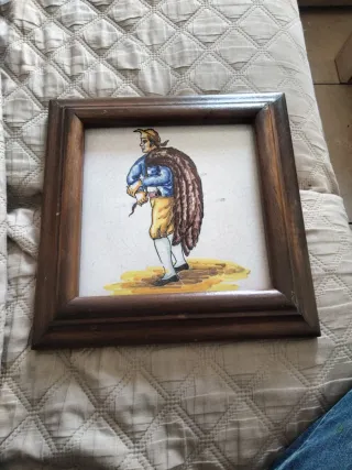 Azulejo antiguo con una escena pintada a mano.Mude 28 por 28 cm. - Figura de un hombre con sombrero y vestimenta tradicional. - Sostiene una fruta o vegetal verde. - Marco de madera oscura.