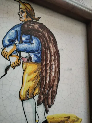Azulejo antiguo con un diseño pintado a mano. Marco de madera incluido.Mide 28 por 28 cm. " El vendedor de pieles" - Figura de un hombre con vestimenta tradicional. - Base de color ocre y blanco. - Marco de madera oscura.