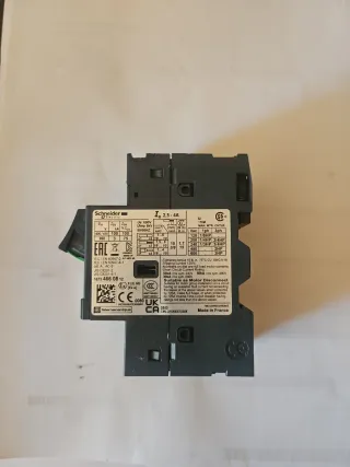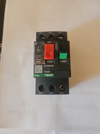 Guardamotor marca Schneider Electric, modelo GV2ME08. - Rango de ajuste de corriente: 2.5-4A. - Botones de parada (STOP) y arranque (START). - Indicador de estado (OFF). - Terminales de conexión marcados como 1L1, 3L2, 5L3 y 2T1, 4T2, 6T3.