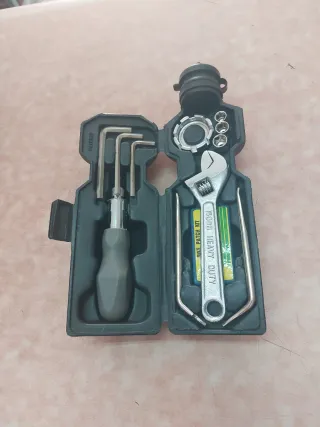 Kit de herramientas compacto para reparaciones de bicicleta. - Incluye llaves Allen y destornillador. - Llave inglesa ajustable. - Herramientas para parches. - Estuche organizador.