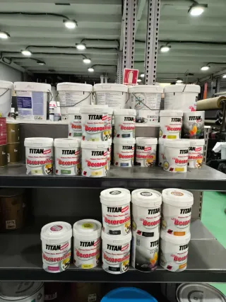 3 beige, 3 verde medio, 4 arena, 2 azul agua, 1 violeta, 3 ocre, 2 chocolate, 1 magenta suave, amarillo limón, 2 azul noche, 2 magenta bohemia, 3 naranjas tostada - Varios cubos de pintura Titan. - Tonos variados.