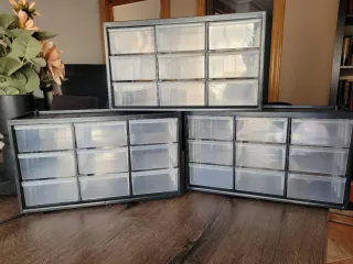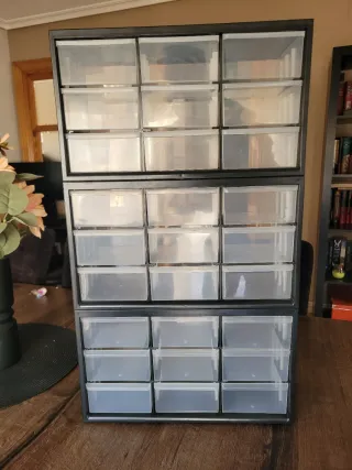Se venden tres organizadores Stanley con 9 cajones cada uno. Ideales para guardar piezas pequeñas, herramientas o material de manualidades. - Cada organizador tiene 9 cajones. STANLEY Organizador de 3 niveles de 9 cajones, Marco de polipropileno de densidad, Cajones blandos transparentes y a prueba de golpes, Apilable, Dimensiones 36,5 x 15,5 x 21,3 cm, 1-93-978