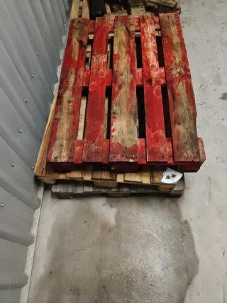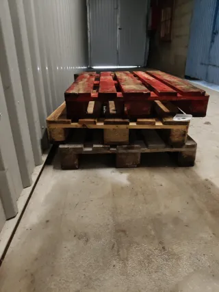 Se venden palets de madera, uno pintado de rojo y otro natural. - Palet superior pintado de rojo. - Palet inferior de madera natural.