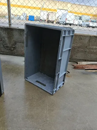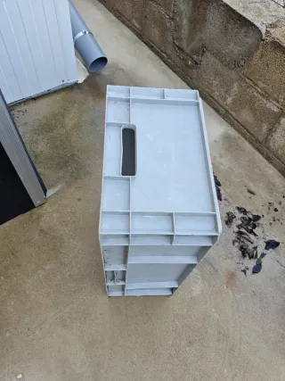 Caja de plástico resistente de color gris. - Material: PVC. - Color: Gris. - Diseño abierto.