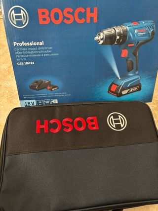 Taladro percutor inalámbrico Bosch Professional GSB 18V-21, nuevo en su caja original. - Incluye cargador rápido GAL 18V-40. - Dos baterías de litio de 18V y 2.0Ah. - Maletín de transporte. - Esta Nuevo en su caja para Estrenar.