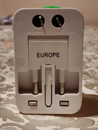 Adaptador de corriente universal para viajes, compatible con múltiples países. - Diseño compacto y portátil. - Indicaciones para USA, JAPAN, AUST, THAI, EUROPE, UK, SP.