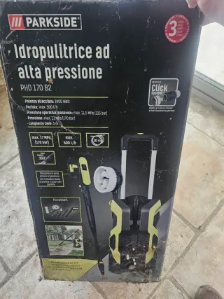 Hidrolimpiadora de alta presión Parkside. - Potencia: 2400 Watt - Caudal: 500 L/h - Presión: 170 bar (17 MPa) - Manguera de 5 m - Incluye accesorios y cepillo - Sistema Click para conexión rápida de manguera