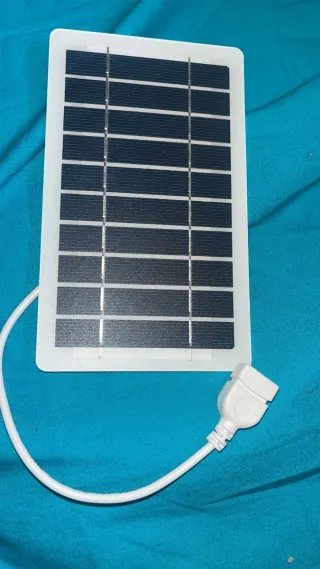 Pequeña placa solar con un cable USB integrado para cargar dispositivos. - Diseño compacto y ligero. - Panel solar con múltiples celdas.