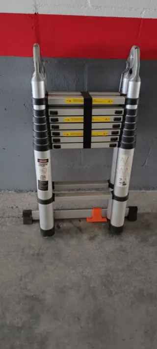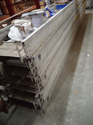 Escalera de aluminio en buen estado. Ideal para trabajos en altura. - Longitud recogida: 5.10m - Longitud abierta: 8.70m - Carga máxima: 150kg - Modelo: 3651