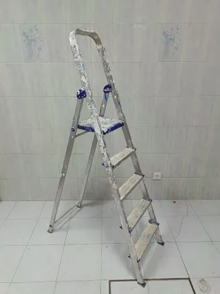 Escalera de aluminio con 5 peldaños, ideal para trabajos en altura. Es ligera y fácil de transportar. Manchada de pintura pero en perfecto estado. Abre y cierra perfectamente. Algo negociable. Visitar mi perfil para más productos. - Material: Aluminio. - Número de peldaños: 5. - Diseño plegable para un almacenamiento cómodo.