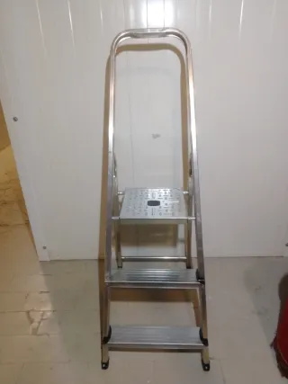 Escalera de aluminio con tres peldaños, ideal para tareas domésticas o de bricolaje. Es ligera y fácil de manejar. - Fabricada en aluminio resistente. Soporta hasta 150 kg máximo. - Tres peldaños antideslizantes. - Diseño compacto para almacenamiento. - Altura del último peldaño 60 cm. - OFERTA 29 € - ( PRECIO NO NEGOCIABLE. NO CONTESTO A REGATEOS ).