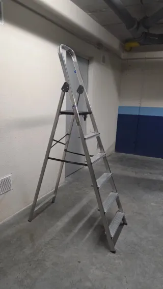 Vendo escalera plegable de aluminio de 5 peldaños. Usada pero en buenas condiciones, estable y sin holguras. El peldaño más alto está a una altura de 1 metro. La altura total de la escalera plegada es de 1.73 m. La vendo porque ahora necesito una más alta. Precio no negociable.