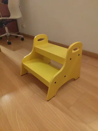Escalera de dos peldaños de Ikea, ideal para que los niños alcancen lugares altos de forma segura. Fácil de mover. - Color amarillo. - Fabricada en madera pintada