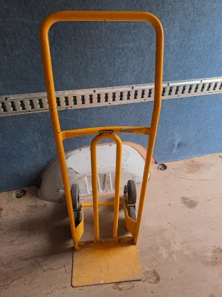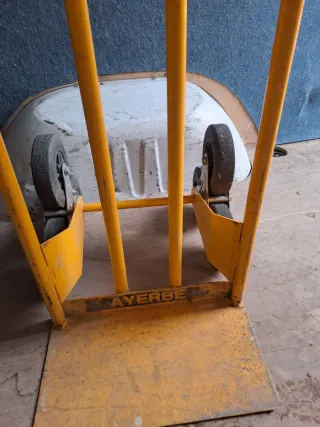 Carretilla de carga de color amarillo, ideal para mover objetos pesados. Se encuentra en buenas condiciones. - Estructura metálica resistente. - Ruedas para facilitar el transporte.