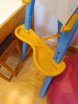 Caballete infantil de plástico en colores azul y amarillo. Ideal para actividades artísticas. Caballete de plástico para niños, ideal para actividades artísticas. - Estructura principal en color azul. - Bandeja y soportes en color amarillo. - Diseño estable y seguro. - Estructura resistente de plástico. - Bandeja inferior para materiales.
