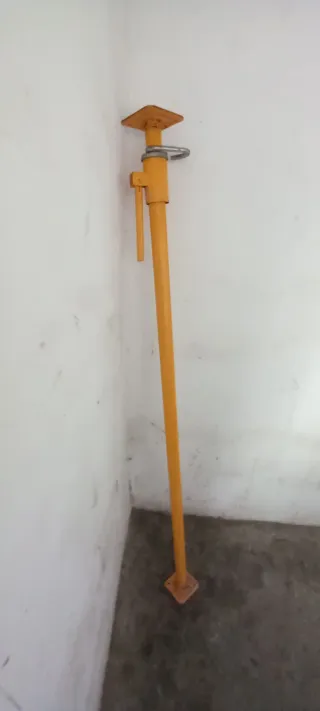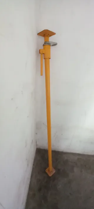 Puntal metálico de color amarillo, utilizado en construcciones. - Base cuadrada en la parte inferior. - Placa superior cuadrada para apoyo. - Mecanismo de ajuste con pasador-1,80-3m. - Engrasado. - No envío. - No negociable.