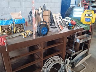 Se vende lote de herramientas para construcción. - Ganchos para andamios - Enrollacables azul. - Caja de discos de corte Zebra y Bosch de widia (sin usar) - Taladro percutor. - Brocas y punteros. - Cargador de batería amarillo. - Trajes de agua verdes - Foco grande - Nivel. - Llave inglesa grande. - Carro de herramientas metálico, etc...