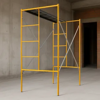 Andamio de construcción de color amarillo, ideal para trabajos en altura. - Estructura metálica resistente. - Plataforma de trabajo. - Fácil montaje y desmontaje.