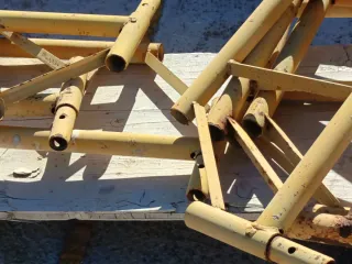 Andamio metálico de color amarillo, ideal para trabajos en altura. Se encuentra desmontado y listo para su transporte. 4 cuerpos 4 crucetas venta solo en mallorca - Estructura tubular resistente. - Componentes de metal.