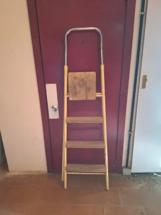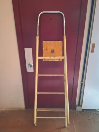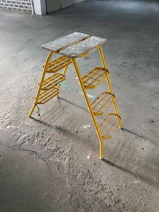 Escalera plegable de uso doméstico. Madera y metal. Medidas desplegada: 145 x 74 x 46 cm Medidas plegada: 153 x 11 x 49,5 cm - Estructura metálica amarilla. - Plataforma superior de madera. - Tres peldaños de madera.