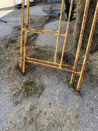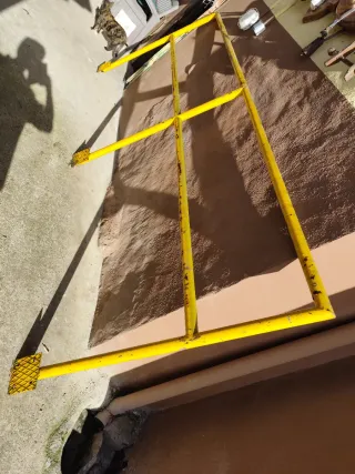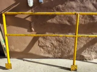 Valla de obra metálica, ideal para delimitar espacios o seguridad. - Estructura tubular amarilla. - Diseño con barrotes verticales. - Presenta signos de óxido, lo que le da un aspecto rústico. 6 vallas 10€ cada una