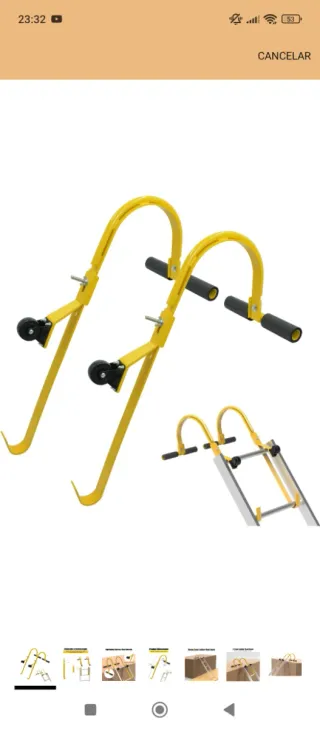 Par de ganchos amarillos para escaleras, diseñados para facilitar el acceso a tejados. - Fabricados en metal resistente. - Incluyen ruedas para un desplazamiento suave. - Mangos de goma para un agarre cómodo.