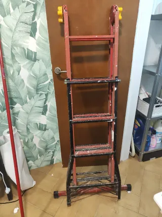 Escalera plegable de uso doméstico o profesional. Es robusta y fácil de almacenar. - Estructura principal de color rojo. - Peldaños y soportes de color negro. - Ruedas amarillas en la parte superior. Solo le falta una tapeta de abajo y a pero está estupendamente