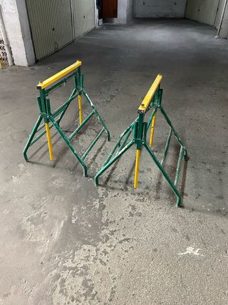 Se venden dos caballetes de obra MACC y una escalera MACC. Son robustos y perfectos para trabajos. - Caballetes de metal verde con detalles amarillos. - Escalera de metal.