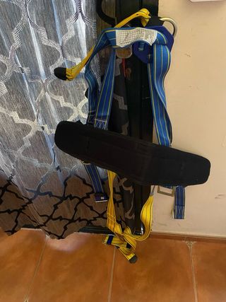 Arnés de seguridad de color azul y amarillo, diseñado para trabajos en altura.pregonta por el precio