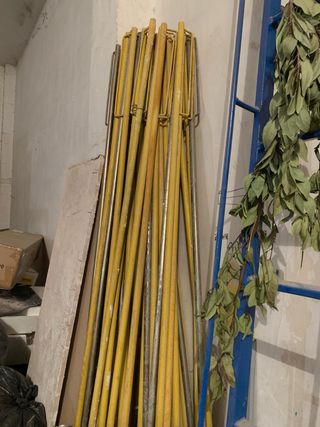 Lote de puntales metálicos 18€ unidad ,comúnmente utilizados en obras de construcción para soporte. - Estructura tubular de metal. - Acabado pintado en amarillo y gris. - Mecanismo de ajuste visible.