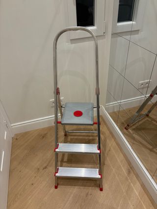 Escalera de aluminio Rolser Única de 3 peldaños, completamente nueva sin uso. La vendo porque me equivoqué y necesito una de 4 peldaños. Muy ligera y resistente, con plataforma y peldaños antideslizantes. Certificada según normativa europea EN-131 (uso doméstico y profesional). Altura abierta aprox. 120 cm. Carga máxima 150 kg. Entrega en mano en Chamberí
