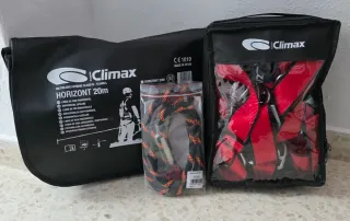 Kit de seguridad Climax para trabajos en altura, incluye línea de vida, arnés y amarre. - Línea de vida horizontal HORIZONT 20m. - Arnés de seguridad rojo. - Amarre de cuerda. - Usado una sola vez. - Precio en tienda 94,58€.
