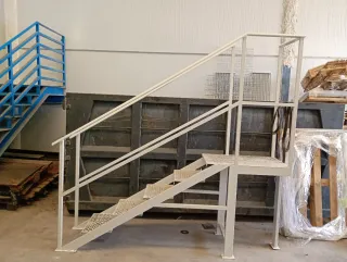 Escalera de hierro con plataforma y pasamanos. Ideal para uso industrial o de almacén. - Construcción robusta de hierro. - Peldaños antideslizantes. - Plataforma superior. - Pasamanos de seguridad.