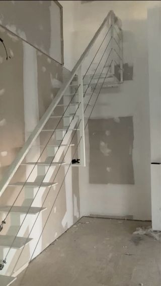 Escaleras modernas con estructura de hierro y peldaños de hierro y madera. - Diseño minimalista y elegante. - Ideal para interiores y exteriores - Barandilla de cable de acero y de hierro