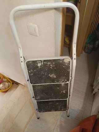 Escalera de tres peldaños de metal, color blanco. Está algo usada, con algunas marcas de desgaste en la pintura. - Estructura de metal. - Tres peldaños. - Color blanco.