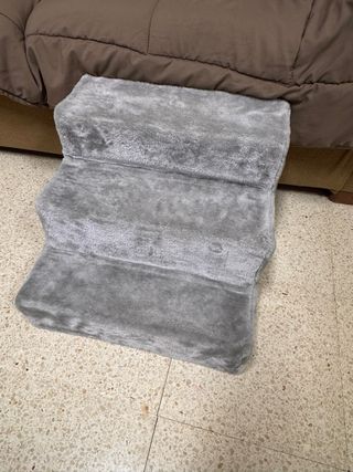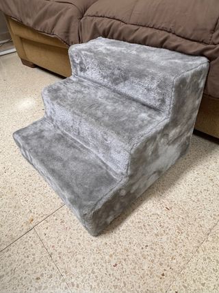 Escalera de tres peldaños cubierta de un suave tejido gris. - Ideal para ayudar a mascotas a subir a sofás o camas. 30cm de alto y 40cm ancho