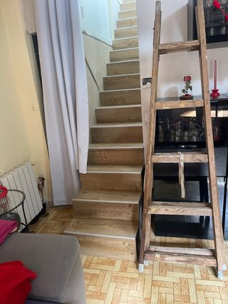 Escalera de madera con marcas de pintura. - Estructura de madera. - Patas con protectores de goma negros.