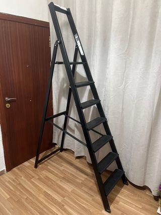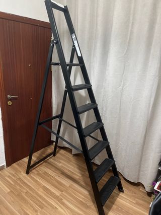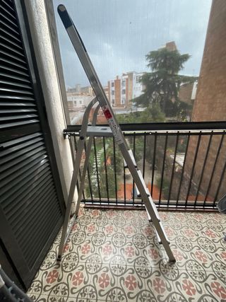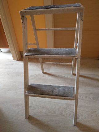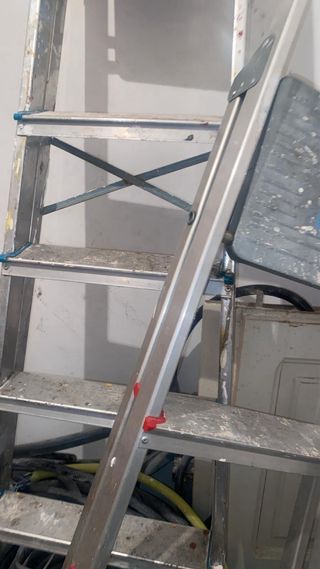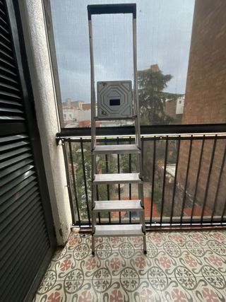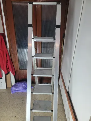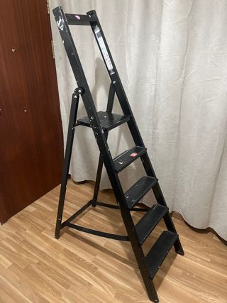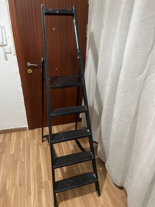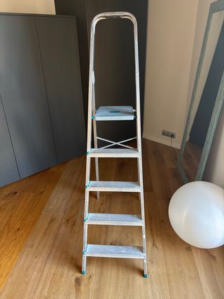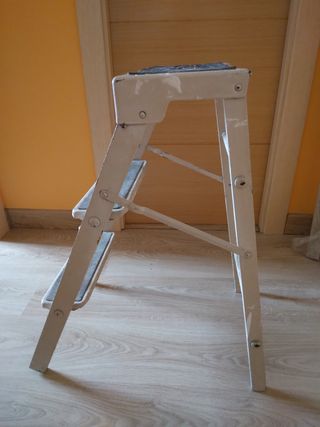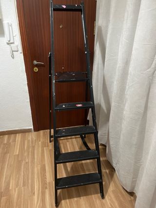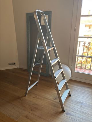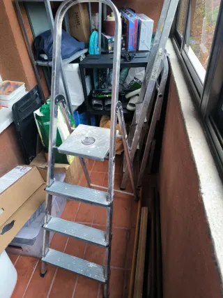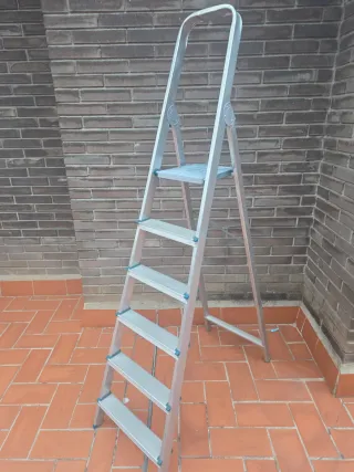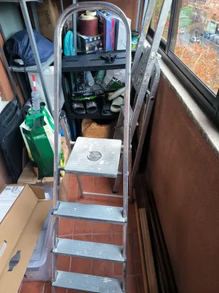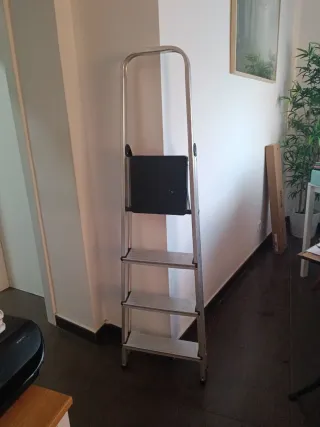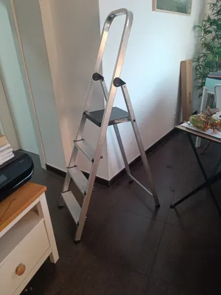 Escalera de aluminio con cuatro peldaños, ideal para tareas del hogar o pequeñas reparaciones. - Fabricada en aluminio. - Cuatro peldaños. - Diseño plegable para fácil almacenamiento. PD. Su precio original fue de 50€. Tiempo de uso: 16 meses. La vendo porque necesito una de 6 peldaños.