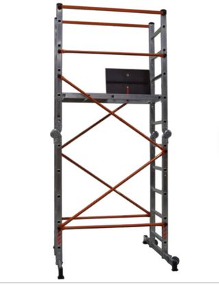 Andamio de aluminio, fácil de montar y transportar. - Estructura robusta de aluminio. - Barras de seguridad naranjas. - Plataforma de trabajo. - Ruedas para movilidad.